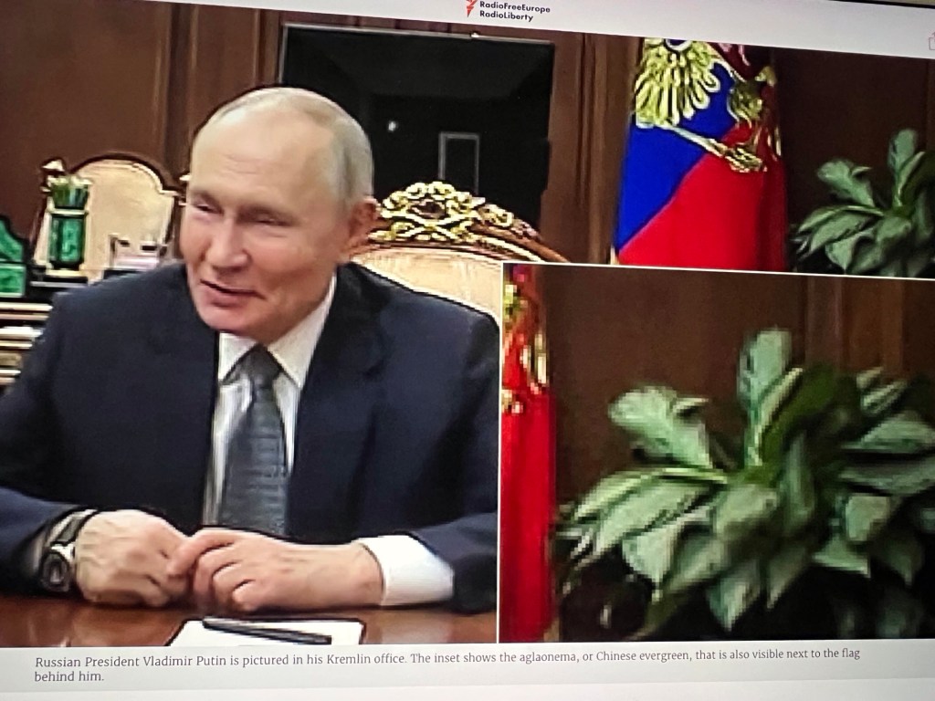 In this case, it has to do with Putin’s well-known paranoia, his constant moving from one location to another in order to disguise his actual whereabouts, and a potted plant.