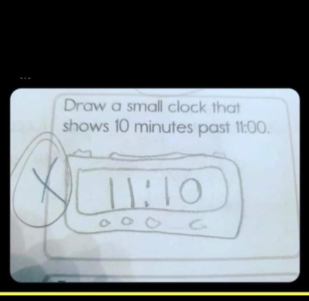 And, though I’m no artist, I drew a beautiful circular clock, with all of the numbers going . . . well . . . clockwise. And I knew where the big hand and the little hand pointed to show ten minutes past eleven. Whoopee!!