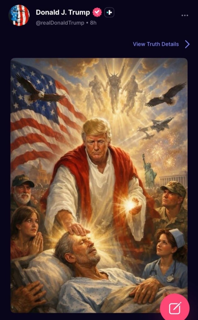But he isn’t; and it doesn’t. It stands for “John” . . . and not the biblical disciple. Yet we have all seen THE PICTURE: the AI-created image of Trump in flowing robes and a full head of blond hair, looking for all the world like a supernatural being, laying hands on a man to heal him.